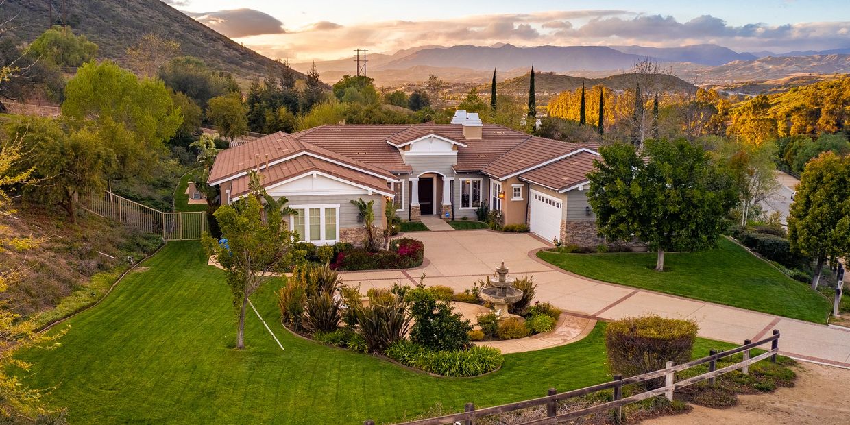 Privately situated near the top of the prestigious Enclave neighborhood est in 2004, this architectural Single Story California ranch estate is in want of nothing. Nestled perfectly on 2.5+ acres w/approx 5,000 sqft of single story luxury living, the estate boasts usable acreage, manicured grounds, and custom high-end interior qualities. Floorplan suitable for multi-generational living or caretaker quarters! 3 bedrooms in North wing + 2 bedrooms in South wing! Indulge in the old world charm of the striking entry fountain, mature orange tree & quaint patio--front porch living that feels more like France and a little less like California. Tapered square columns flank the entrance door, opening up to the entertainer's estate you've dreamed of but couldn't find. Soak up the sun in the wide open rear yard boasting a classically designed Roman pool/spa with waterfall feature, substantial rustic pergola w/café lights, outdoor stone clad Dacor BBQ + bar, mature Key Lime tree, & lush landscape. Private mountain backdrop with sunset and sunrise skies, remind you that this strategically positioned house was built to capture extensive privacy, serenity, and mountain views. Highlights: Cul-de-sac! Original Owner! 4 car direct access garages! Zoned for horses! Flat 1+/-usable acre ideal for vineyard, orchard, horses, or your own desires! Wide hallways! Gourmet kitchen w/Wolf 6 burner+ grill stovetop, Wolf double ovens, SubZero refrigerator/freezer,island w/seating, trash compactor. European Versailles pattern travertine floors with custom floor medallions. 3 gas fireplaces, central vacuum sys, energy efficient multi zoned HVAC sys, surround sound sys, wired for home theater in Din room, Fam room & Master bed/bath, custom hand crafted cabinetry, Butler's pantry + wet bar w/wine fridge, oversized walk-in pantry, laundry room w/Whirlpool Dry cleaning Valet. Water Softener sys. This Thousand Oaks property captivates the senses and invites you to a home that serves as a haven from the outside world.